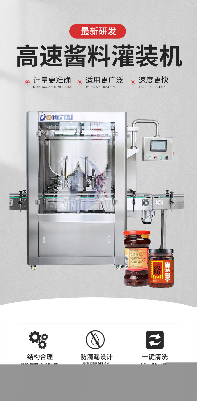 如今我们的生活有着明显的提高,随着消费水平也在不断提高的同时,市场中的产品种类不断增多,也更加注重的产品的品质,尤其体现在包装上。俗话说:人靠衣装,马靠鞍,当然一件好的产品自然也少不了一个精美的外包装。今天,就随小编一起来了解下辣椒酱的生产需要怎样一款辣椒酱灌装机设备,让您不仅喜欢吃辣椒酱,更爱辣椒酱灌装机设备。