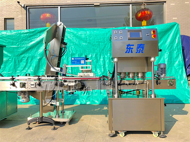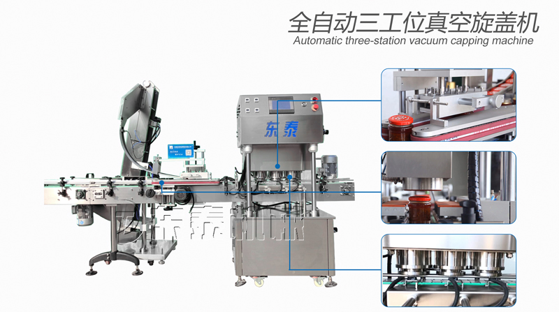 全自动三工位真空旋盖机是bet365体育结合用户使用情况,摒弃了传统转盘式真空旋盖机的弊端,研制开发的新型高效设备,设备自动检测到两个瓶子盖子进入到双头真空旋盖机内,旋盖机彩色显示屏会实时显示旋盖状况,整机多点检测,当进口无瓶无盖、出口堵塞、定位不准、瓶身倾倒均自动停机。单个旋盖头达到的真空度都可以单独显示,单独调整。