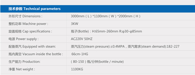 1、该机集自动理盖、上盖、蒸汽喷射、自动真空旋盖于一体,生产速度快,效率高,运行稳定可靠。